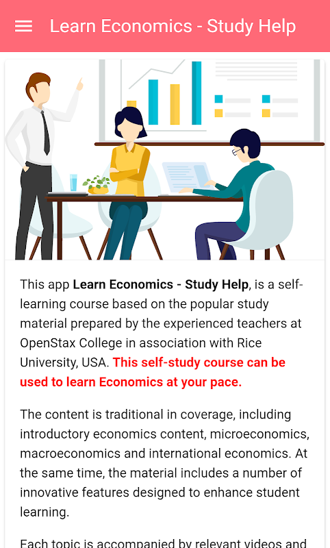 The app - Learn Economics - is structured in such a way as to cover all the topics that are required for beginners as well as for more advanced students and thereby provide a solid foundation in Economics to help them ace college exams and major field tests.