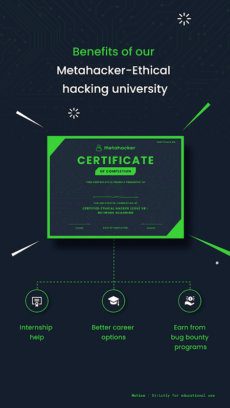 MetaHacker - Ethical Hacking University is one of the leading platforms to learn about Ethical Hacking. This free software includes easy-to-understand small courses to learn from. Crafted to teach aspiring ethical hackers the skills necessary to become advanced-level hackers⏫.