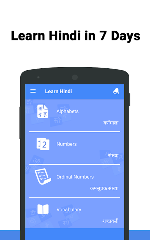 Learn Hindi is one useful app for the users who want to learn Hindi in record time. Let this app be your tutor to guide you for learning Hindi from English with all required courses. This app contains all the elements, including Hindi alphabets (हिन्दीअक्षरमाला), Hindi sentences, Hindi conversation and Hindi audios for the learning of Hindi language.