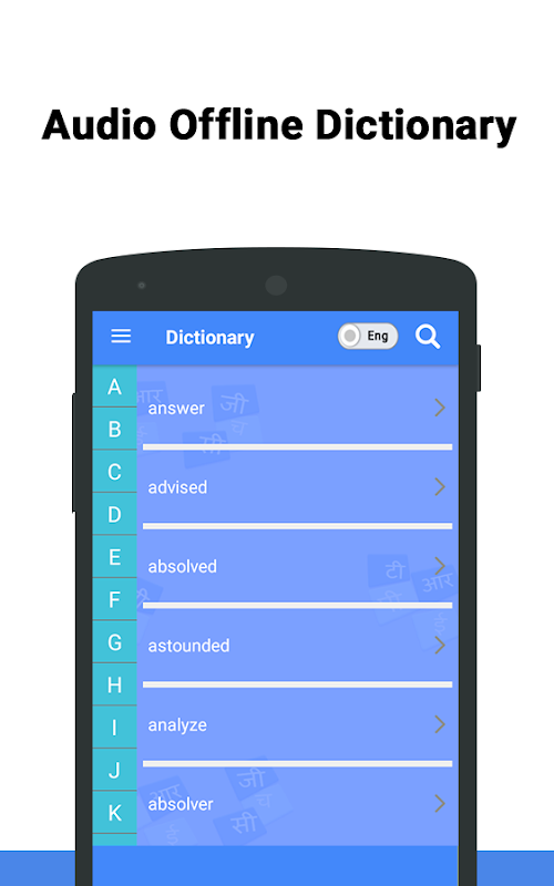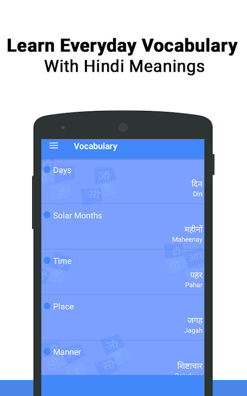 • Vocabulary: Vocabulary acts as a store to learn words particular to any language which helps in assisting a user to learn Hindi words of daily use from Days to colors, fruit names to health related words and weather to body parts with clear Mp3 voices