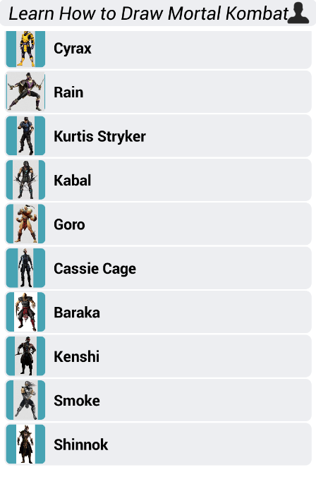 Let’s draw your favorite item from Mortal Kombat characters step by step in a new application for mobile drawing! just take a paper and a pencil, choose the characters you like. It is very easy to use.