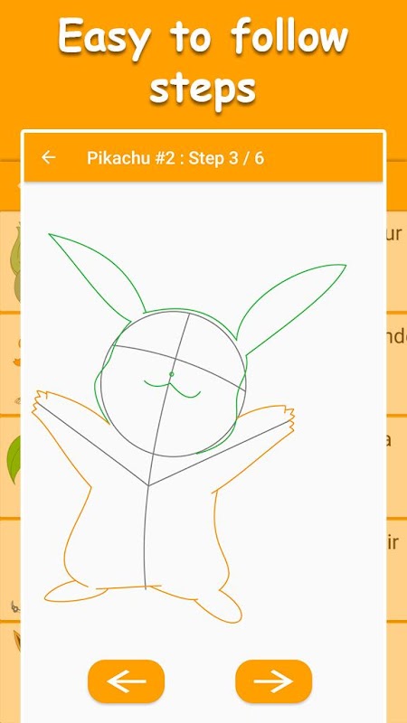 learn how to draw pokemon step by step easy is a really easy to use application you have a simple menu whose you can share, rate and see more how to draw apps to get more drawing ideas and there are many of easy things to draw that are a simple drawings maybe you can find your favorite cute pokemon in here, and from this same menu you can click the start draw button then you have a list of cute drawings that you can find many drawing ideas for each character you can see the number of steps and a level of difficulty. choose your level and click to reach all the steps to follow to get a nice and simple drawings of your favorite cute pokemon, have fun to draw.
