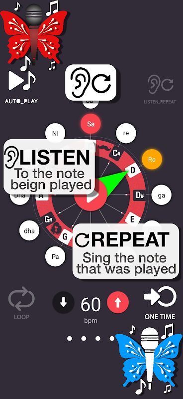 4 Guided Listen & Repeat Mode:- Learn to sing in tune by listening to a note, seeing it highlighted on the wheel, and then repeating it. The app waits for you to hit the correct pitch before moving on.