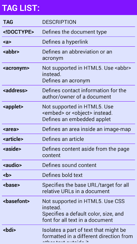 In this application you will find a list of tutorials, symbol, tag and a editor.