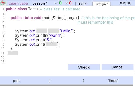 You can get access to the next lesson if you answer correctly at least 8 out of the last 10 questions. Each lesson contains full instructions. Thus, the program Learn Java helps you learn the basics of Java programming in a fun way.