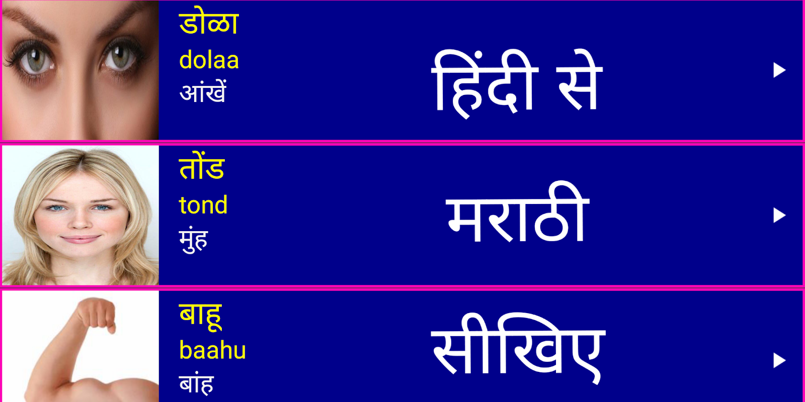 2. Each Marathi word has a clear image 📸🖼️ and audio pronunciation 🎵🔊 to make Learning Marathi via Hindi Easy.
