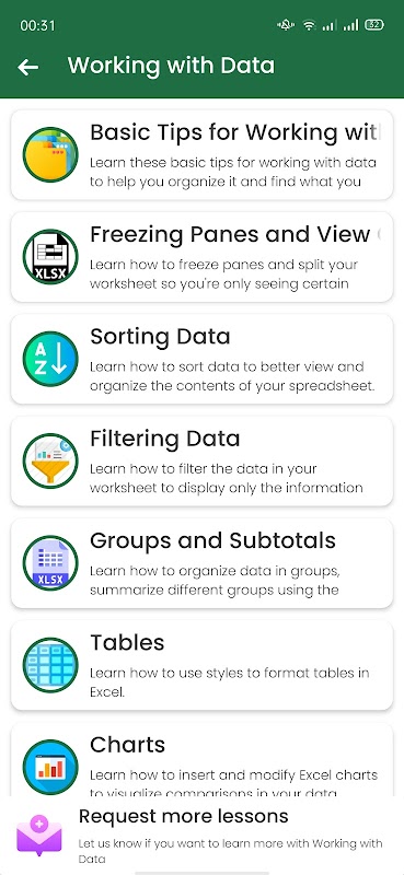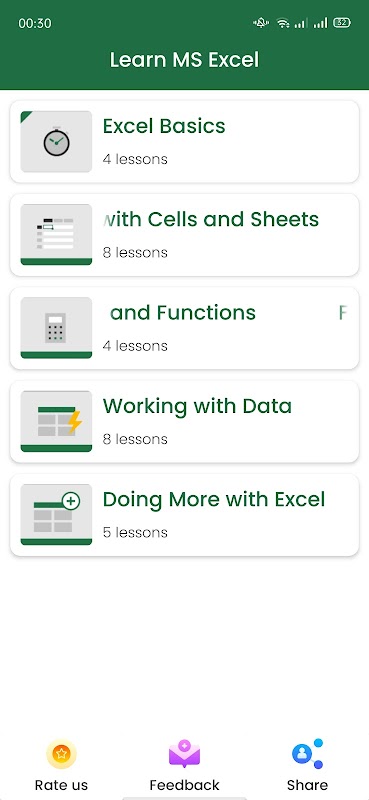 The Learn MS Excel presents you with very detailed lessons, below are the contents and features of the application: