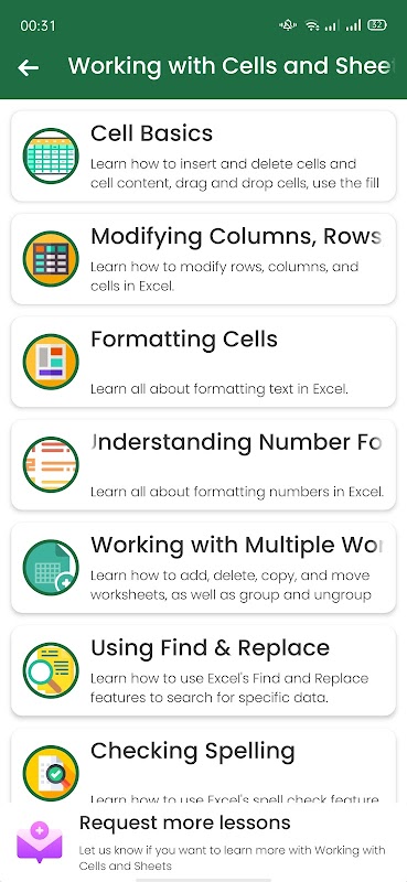 - Working with Cells and Sheets: Includes 8 lessons such as: Cell Basic, Formatting Cells, Number Formatting, Checking Spelling.....