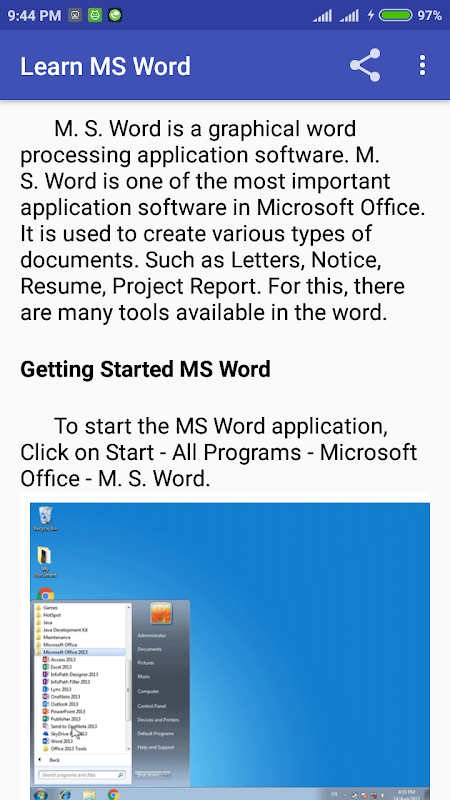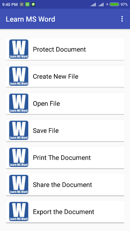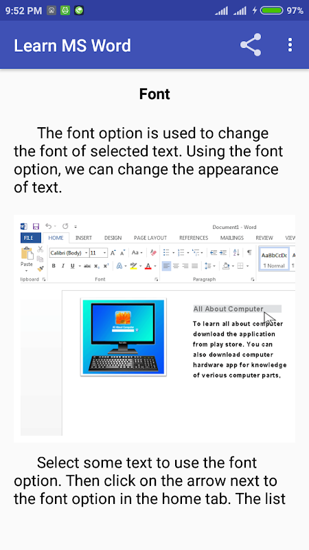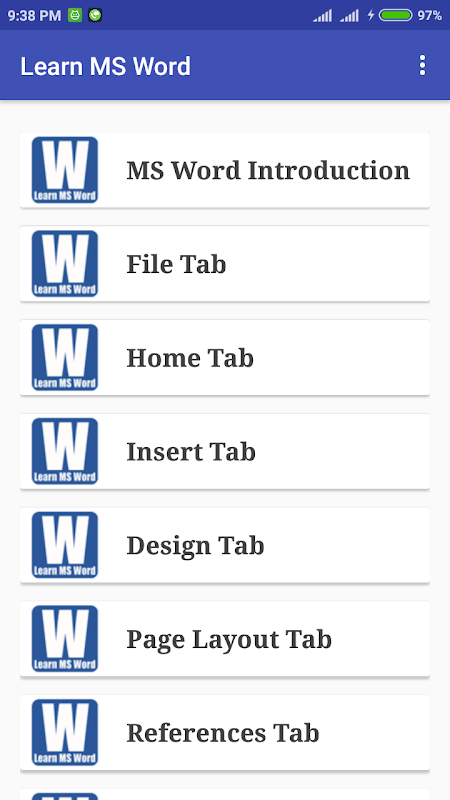 Learn MS Word app will help you increase your knowledge about MS Word. Using this app you will be able to learn how to use MS Word application in computer. This app includes information about how to use different tool in MS Word. This app will definitely help you to increase your knowledge of MS Word.