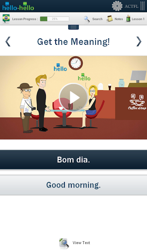 Hello-Hello Portuguese is a full-fledged language course with 30 LESSONS developed in collaboration with the American Council on the Teaching of Foreign Languages (ACTFL), so you can be assured that these lessons follow an effective research-based methodology. All lessons are conversational based on realistic dialogues and situations, rather than a collection of out-of-context words and phrases.