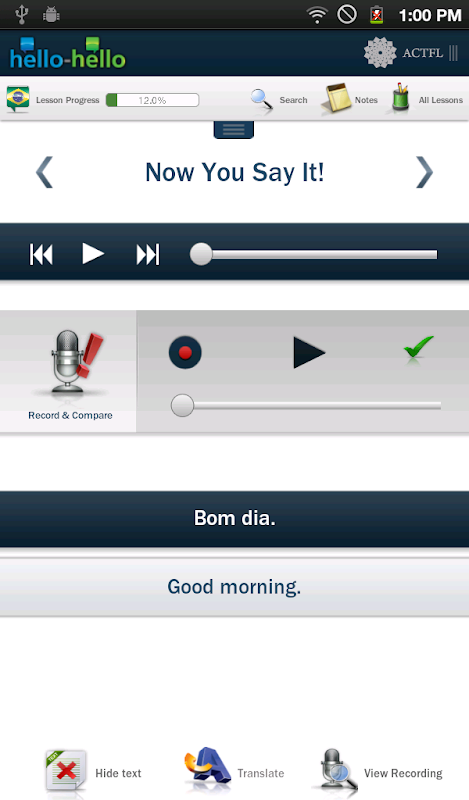 All the content is stored in the app so that you have great responsiveness when you are ready to learn a language. You do not need to be connected to Wi-Fi or 3G networks to run the app. With Hello-Hello Portuguese you will be able to do the lessons and practice vocabulary anytime, anywhere developing all the skills you need to communicate in a foreign language. All lessons were recorded by native speakers so you can learn the correct pronunciation.