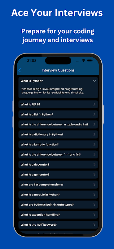 Built-in IDE: Practice coding directly in the app. Our integrated Python Editor allows you to write Python code without the need for external tools. The Python Compiler lets you test your code instantly to ensure it runs as expected.