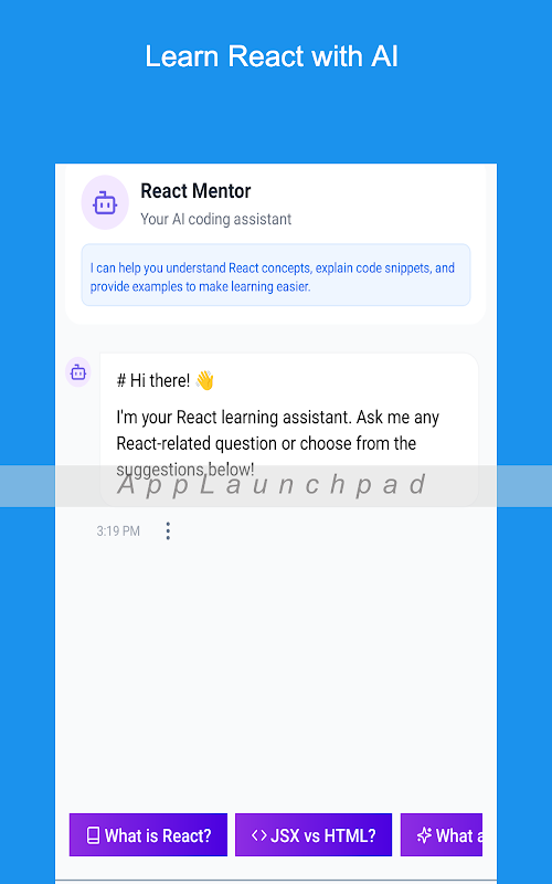 Ask questions about React and get instant, accurate answers from our AI tutor. No more being stuck on tricky topics!