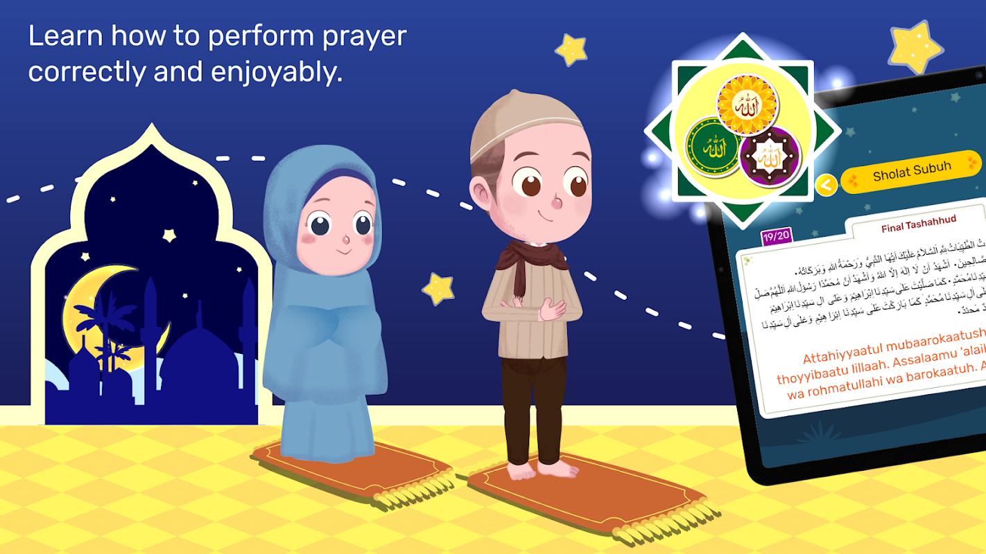 Fun Islamic app for kids to learn shalat with audio, pictures, and games.
