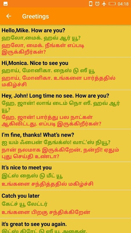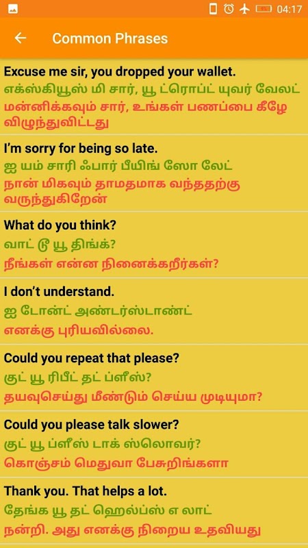 This Learn Spoken English Through Tamil app is for beginners and intermediate level learner who want to learn English through Tamil. We have divided the app into various topics so that the learner can easily find out the topics they want to learn. We have translated the English text in Tamil form so that the beginners who know only Tamil also find this app very useful. And you can use this app as a guide while you traveling.
