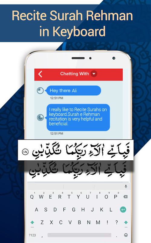 Download this Islamic keyboard or surah rahman keyboard latest. Type your message by using such keyboard you can send the text to your friends. If you are religious and inspired by this English typing keyboard along with the Surah e Rehman banner running over the typing keyboard. This Qurani Surat Keyboard is a perfect Android application for your smart mobile phone or tablet.