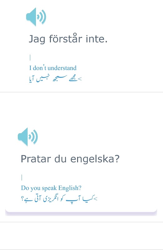 Learn Swedish in Urdu App is the app designed for learning Swedish at yourself. Everyday life essential phrases, 45 plus categories of topics with more than a thousand vocabulary used in different situation along with English and Urdu Audio translation. This fits for visitors, tourists and students studying at school, college or university.