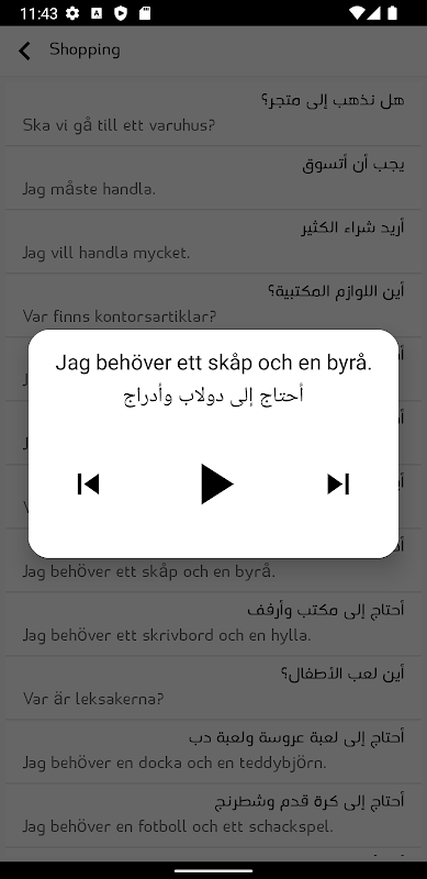 • Audio lessons to learn the correct pronunciation of the Swedish language.
