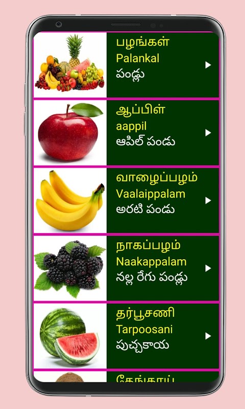 2. Each Tamil word has a clear image 📸🖼️ and audio pronunciation 🎵🔊 to make Learning Tamil via Telugu Easy.