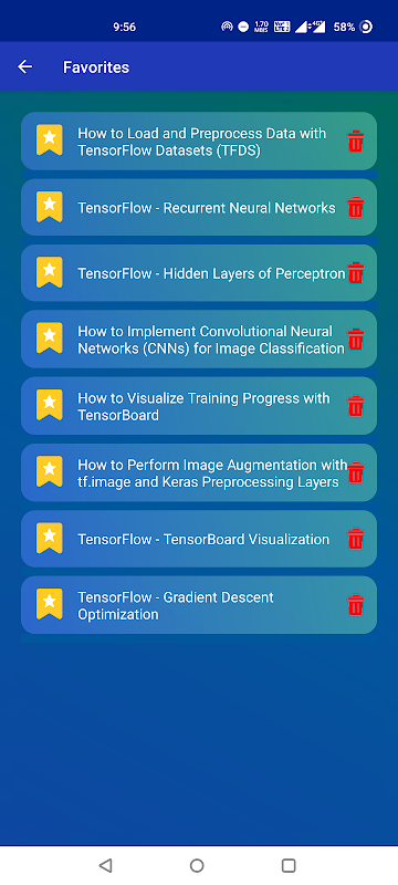 TensorFlow is a complete offline learning app that makes artificial intelligence and machine learning accessible for everyone. Whether you're a beginner in deep learning or preparing for real-world TensorFlow projects, this app gives you well-structured lessons and practical examples in a clean and interactive design.