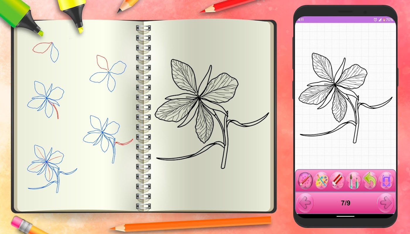 Learn how to draw Beautiful Flowers is a Free and Wonderful drawing app step-by-step. How to draw Flower designs app is best self learning app. Draw Flower sketch is a fun activity. You can draw on your phone screen and share it with your friends on Social media or you can take a paper, draw on it by following instructions from this drawing tutorial app. It is a very simple sketch Flower design app that will be most useful for beginners who learn about how to draw flowers.