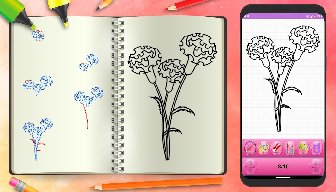App contains step-by-step drawing tutorials of all the popular flowers: