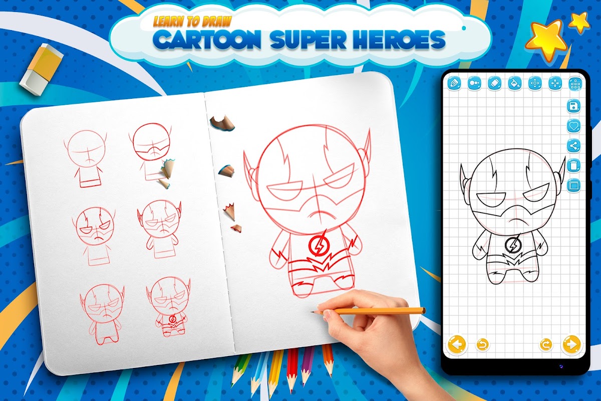 Learn to Draw Cartoon Heroes is perfect app for those who want to be an artist and love drawing cartoons and superheroes at the same time. This app teaches you how to draw super hero cartoon characters in simple steps and improve your confidence of drawing and coloring.