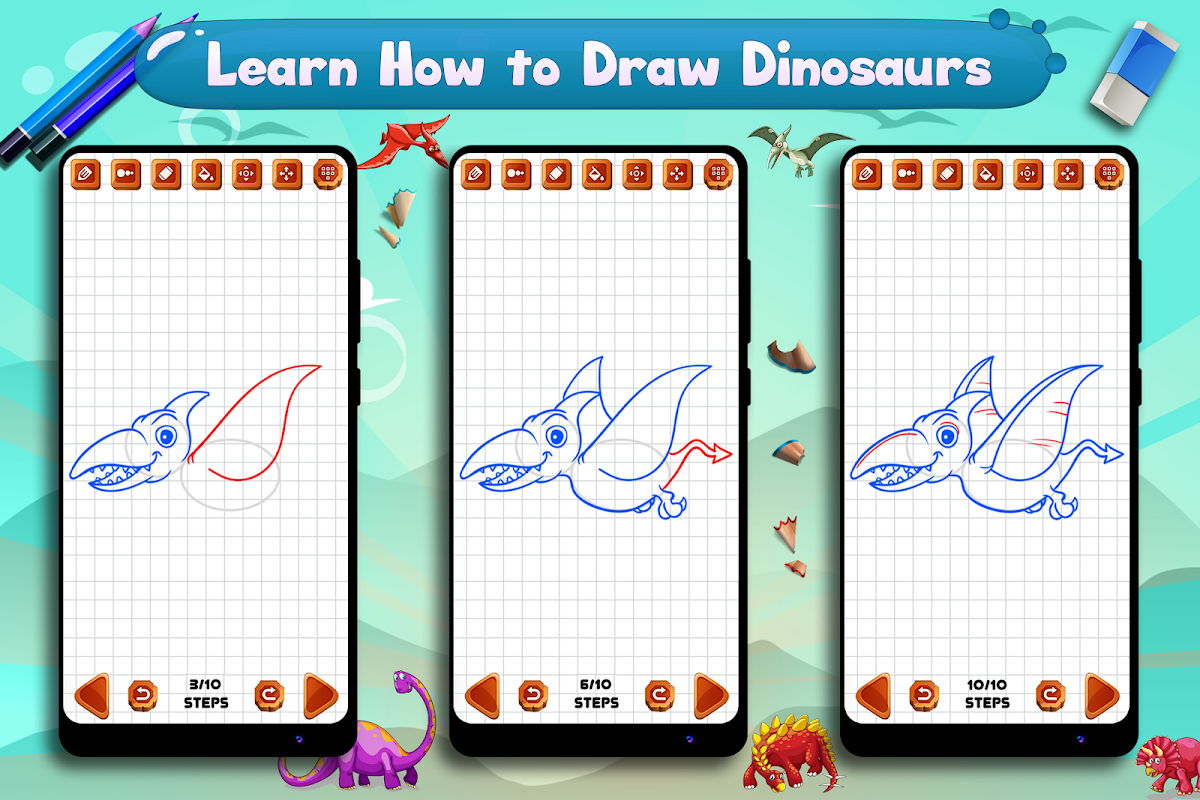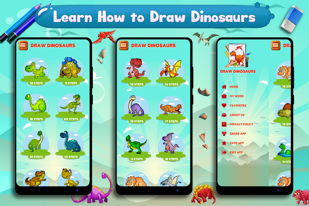 Learn to Draw Dinosaurs is perfect app for those who want to be an artist and love drawing cute dinosaurs. This App teaches you how to draw cute kawaii dinosaur in simple steps and improve your confidence of drawing and coloring.