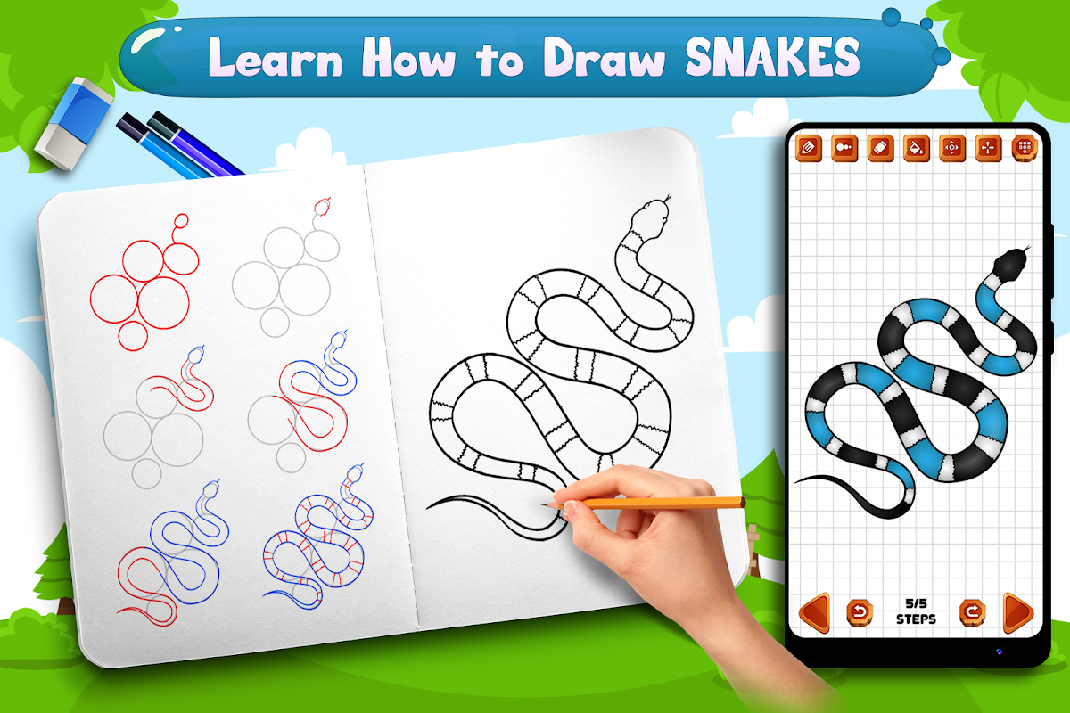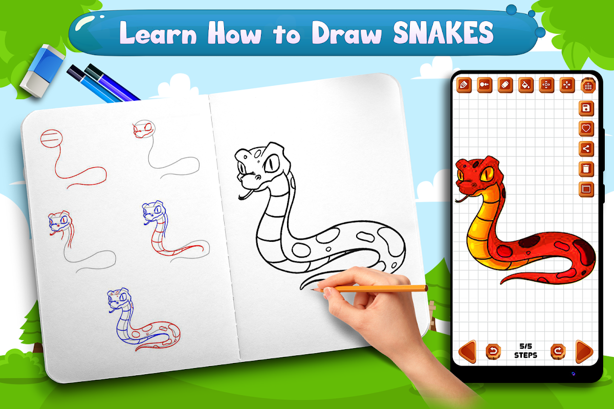 Learn to Draw Snakes is perfect app for those who want to be an artist and love drawing reptile animals. This App teaches you how to draw cute kawaii snakes in simple steps and improve your confidence of drawing and coloring.