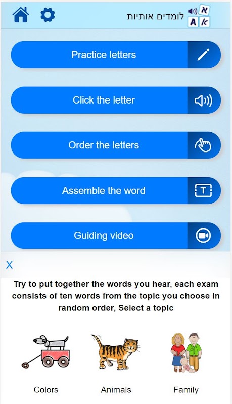 4. Assembling a word - yoc can choos a word bank by topics: family, animals and colors each topic contains up to ten words. After selecting the topic, you will hear a word and you will be asked to drag the letters to the appropriate box. on the correct letter you will hear encouragement, If you're wrong you will be asked to try again