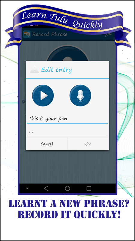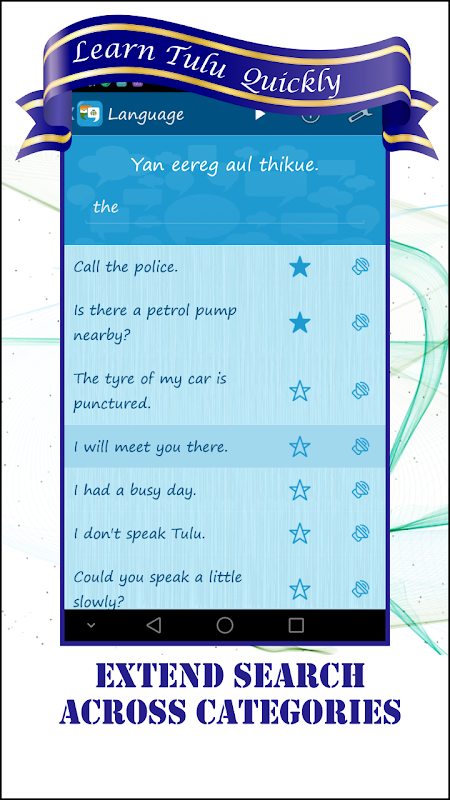 The app turns learning into a fun-filled experience. Learn using quizzes, flash cards and by recording your own phrases. You will be able to learn spoken Tulu easily and fast at home, while being entertained at the same time. Not only that you’ll learn to speak Tulu, but you will learn spoken/conversational Tulu as well!