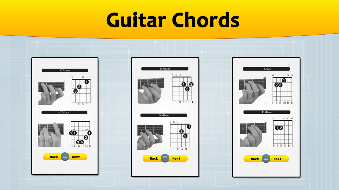 Guitar learning apps consist of learns guitar chord and learning guitar through song with its chord. These beginner guitar chords are used in thousands of guitar songs, and, because they are movable, you can use how to play guitar chords in any key.