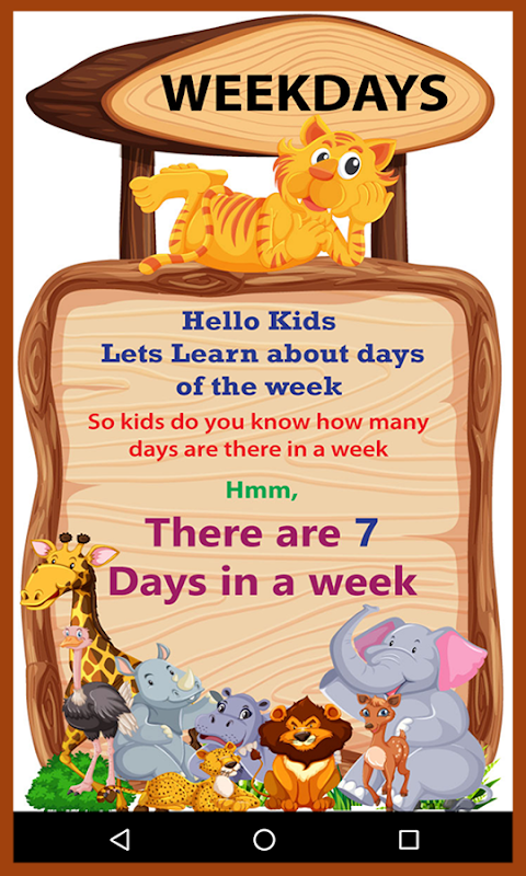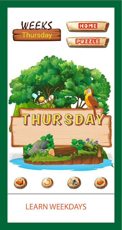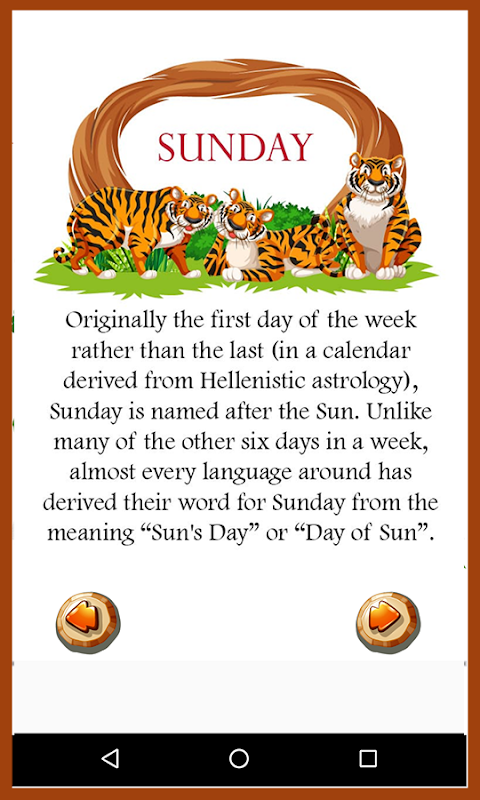 SUNDAY, MONDAY, TUESDAY, WEDNESDAY, THURSDAY, FRIDAY, SATURDAY: with sounds refresh button speaker puzzle and facts