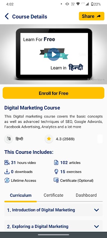 LearnVern's Digital marketing course is compared and extensive to the google digital marketing course and it is offered in Hindi. If you are planning to Learn Microsoft then the LearnVern app has all the courses for MS Word and MS Excel.