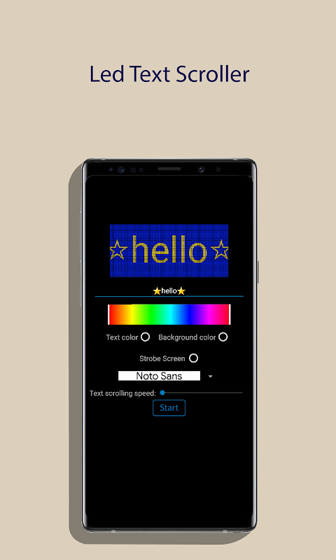 App that generates a text scroll on the led screen from the text entered by the user. You can choose between various text and background colors, fonts, text scrolling speed and screen strobe effect.