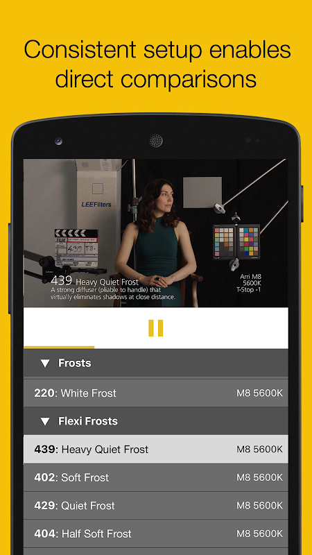 The Official LEE Filters Diffusion Comparator enables lighting designers to directly compare different diffusions lighting a model. As the video plays simply tap to switch the diffusion in real time.