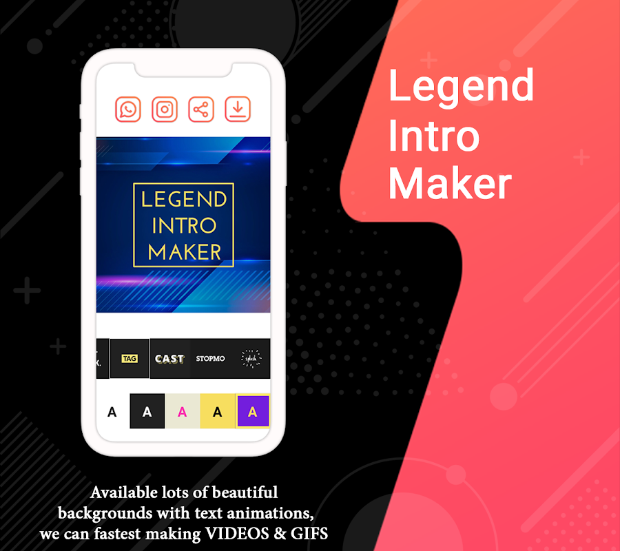 Legend - Intro Maker, Animated Text Video Maker - Gif Maker app where you can overlay colorful background with lots of text animation which is look like gif animated text or animated text video.