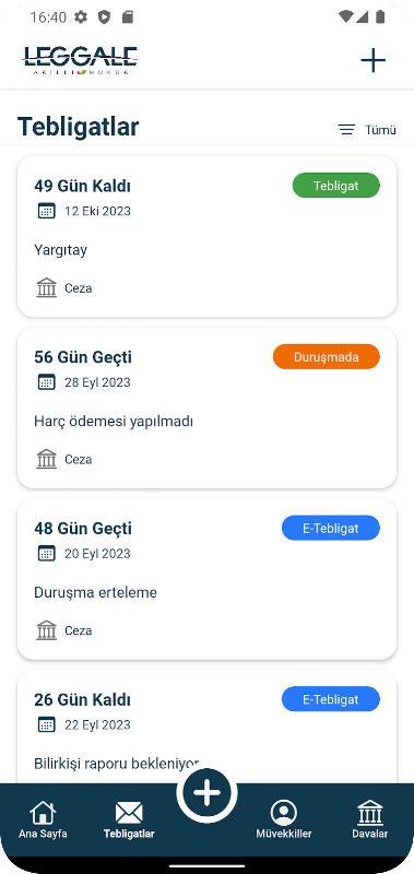 You can calculate your lawsuit fees and notification duration with Leggale. You can follow your clients, cases, notifications and current news.