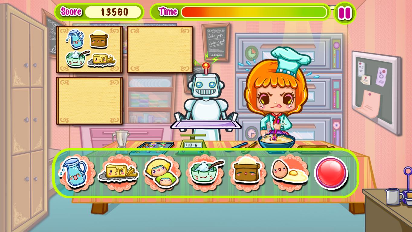 Vernice, a lovely baker that is very passionate in baking is very busy working and enjoying at the same time. Help Vernice, to take order from the customer and deliver it to her so that she can make the food before time runs out. From time to time, Bot Bot the assistant robot will throw away unwanted order that you mistakenly made.