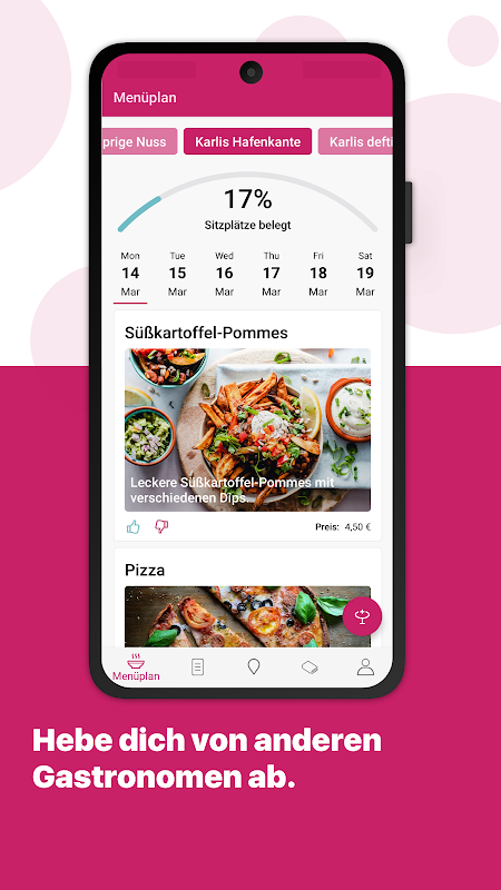 Zeige deinen Gästen welches Lieblingsessen sie wann erwartet. Du bietest in deinem Lokal Tagesgerichte an oder betreibst eine Kantine? Sehr gut, dann bring deinen Menüplan für deine Besucher in die App. Jedes deiner Lokale kann seinen ganz individuellen Menüplan haben. Einfach Menüplan erstellen, einen Tag hinzufügen und dem Tag die gewünschten Gerichte hinzufügen. Das wars.