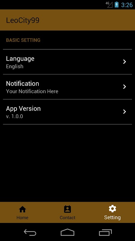 - Allow user to contact LeoCity99: call, sms and via other contact application.