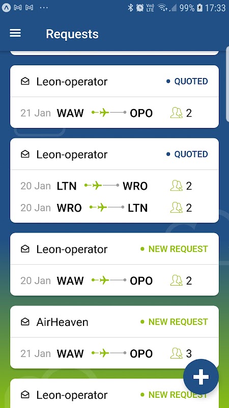 The Leon Sales mobile app is intended for Leon users involved in sales. The application allows you to create, evaluate and send flight quotes. It also allows you to communicate with charter brokers and clients.