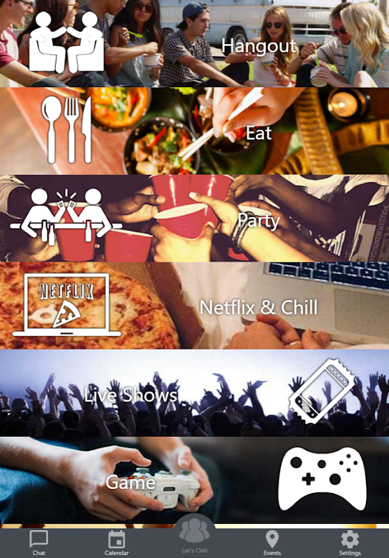 Find new friends by category, such as "Let's Eat", "Party" and more.