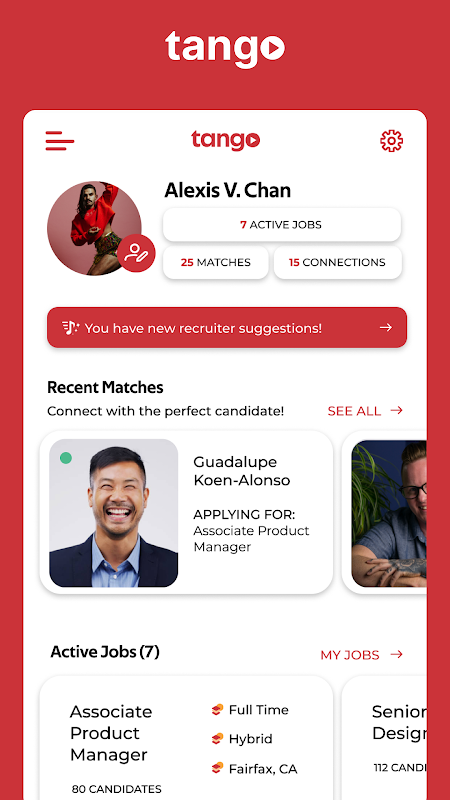 LetsTango's core functionality revolves around a swipe-enabled video platform that connects employers and candidates in a visually engaging manner. Candidates create profile videos where they can showcase their personalities, passions, and skills. Employers, on the other hand, create company and job video profiles highlighting their values, missions, and culture. The swipe-enabled feature allows both parties to express interest and pre-engage ensuring a seamless and intuitive user experience.