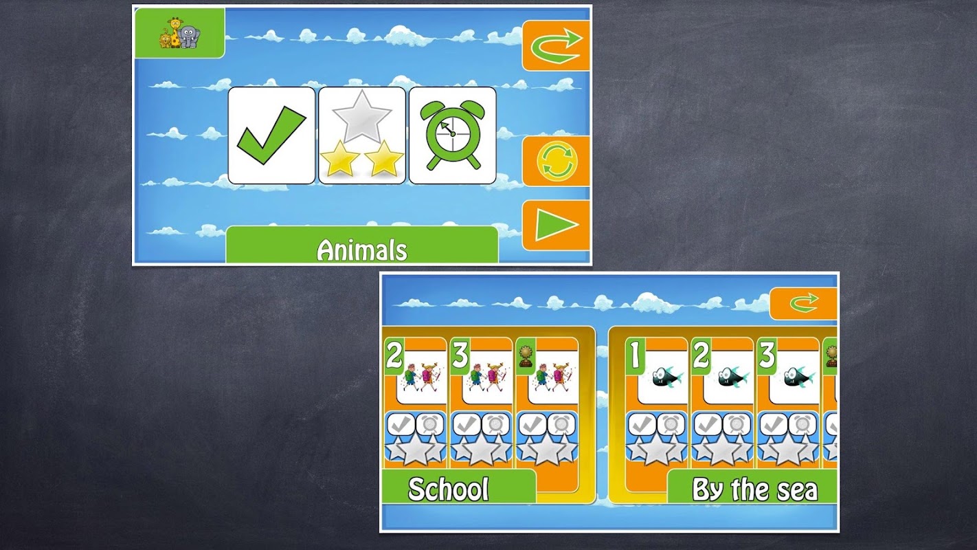 The game is adapted for children aged 4 to 8, regardless of whether the pupil goes to school, kindergarten, pre-school or primary school. Children in higher grade may also profit from the game in case of various reading and/or spelling difficulties such as dyslexia. You can also use the game to learn some basics of foreign languages, regardless of your age: thanks to the audio clips, you can discover learn the pronunciation of the individual phonemes in each word. You hence not only learn a translation of the word, but have a native speaker show you the meaning and the spelling of each word. Of course, this is not meant to be a complete linguistic pedagogical environment: the words offered are all nouns and there are as of yet no adjectives, verbs and no punctuation. Learning the language is based here on a challenging speaking vocabulary trainer. This app however can be used as an interactive introduction to the acquisition of speaking skills for individual words. The game does not contain a dictionary and is not split up in individual lessons, but rather in levels with various themes such as pirates, animals or vehicles.