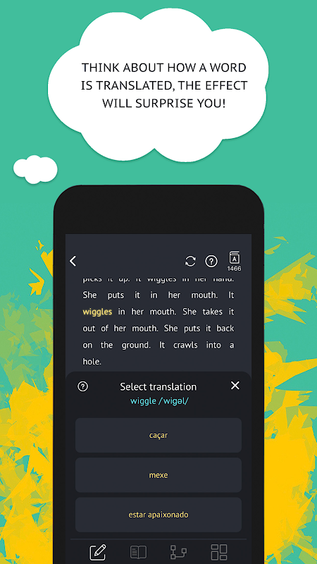 Lexican will select a story for you in which you only do not know 5-9 words. The stories are written in such a way that you can guess how these words are translated, if not, Lexican will help: