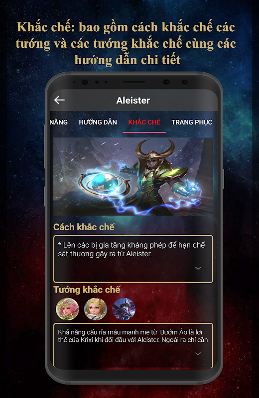 - Khắc chế: bao gồm cách khắc chế các tướng và các tướng khắc chế cùng các hướng dẫn chi tiết.