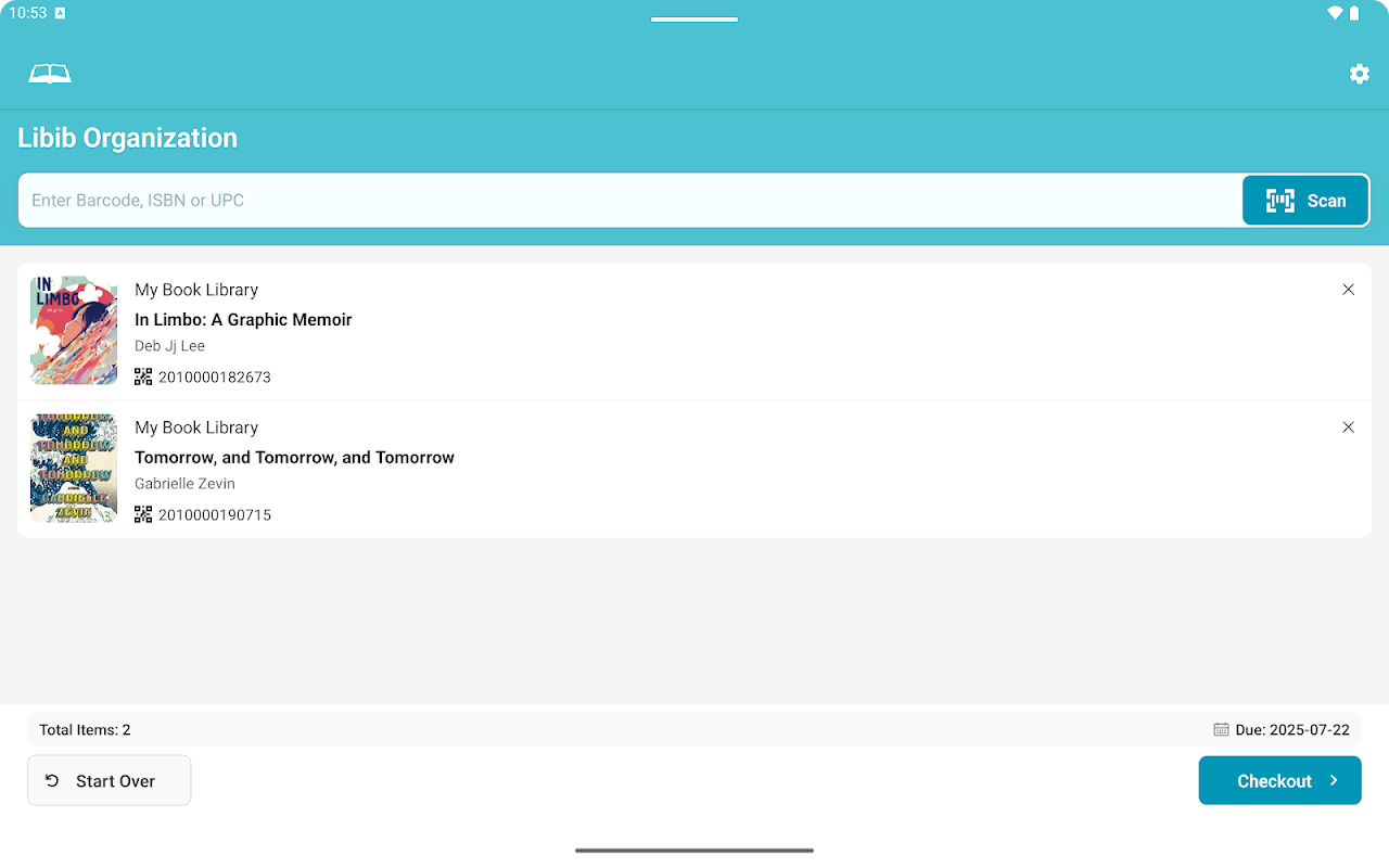 Libib Kiosk Pro allows Pro users of Libib to setup an external kiosk app in their library for their patrons to self-checkout any cataloged items with a barcode.