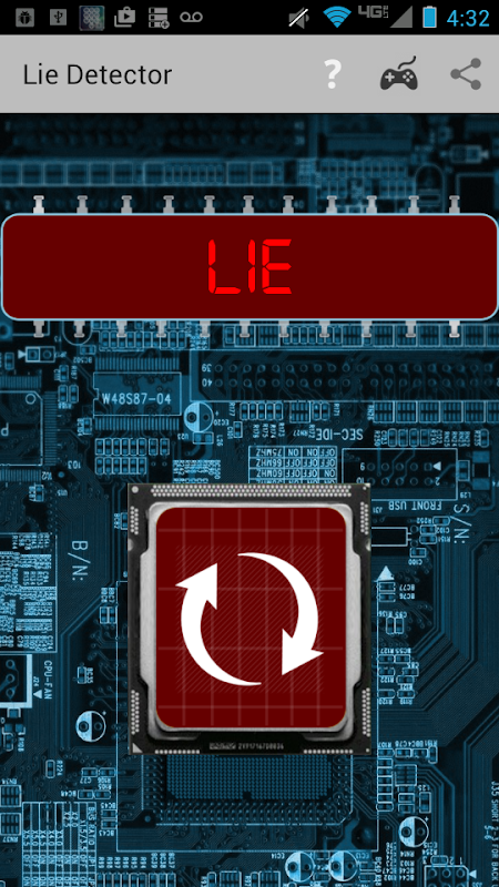 Lie Detector Party Game Prank makes out to simulate a "blood pressure, heart rate, sweat production, body temperature and fingerprint scanner" analyzer to determine whether the subject is lying or not. When you press your finger on the button, what it actually does is spit back a random Truth/Lie response - unless you toggle the volume button during the scan. An up will result in Truth and a down in Lie, every time. In this way you can rig the app to work in your favor.