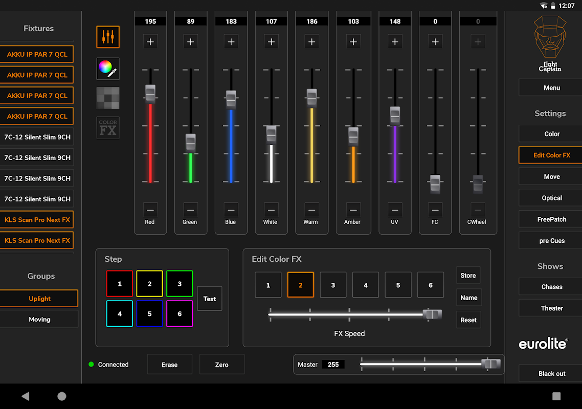 Light Captain can inherently control four color segments on each fixture, each with up to 8 basic colors. No matter if KLS system, LED bar with 4 segments, or wash light with four rings, everything can be easily created and adjusted. For color effects, there is a separate effect section with 6 pre-programmed effects, which can also be modified in the expansion stages.